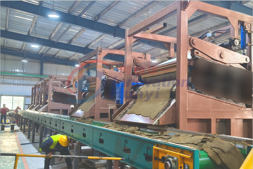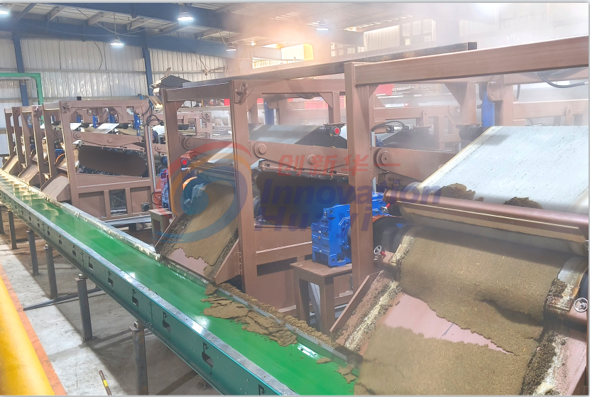 五臺全新高壓帶式壓榨過濾機正轟鳴運轉(zhuǎn)。牛糞經(jīng)過均勻布料裝置鋪在濾帶上,隨著設(shè)備運行,糞水被迅速擠壓分離,排出的濾餅含水率穩(wěn)定在50%以下,同時完整保留了牛糞中的粗纖維結(jié)構(gòu)。
