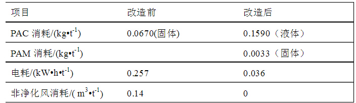投入使用的渦凹氣浮機組運行良好,設(shè)備振動及噪音很小;產(chǎn)生的氣泡均勻細密;出渣細密,分布均勻;出水清澈,無明顯油花。下表為改造前后生產(chǎn)運行數(shù)據(jù)對比: