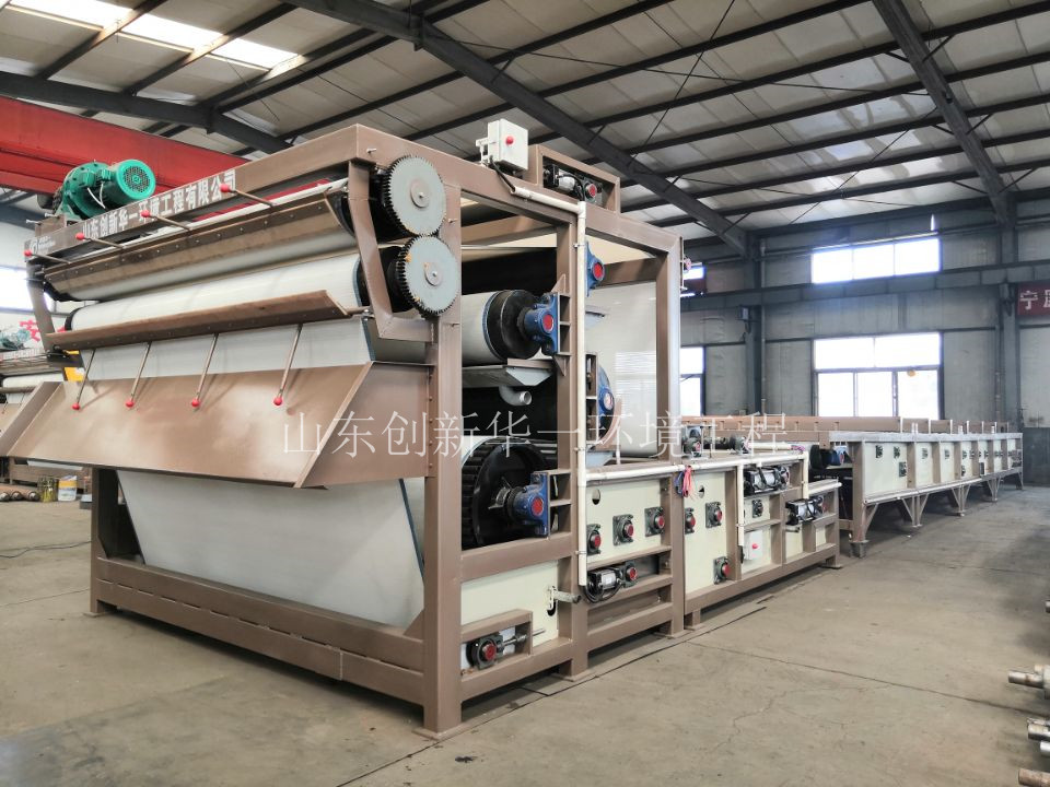帶式壓濾機(jī)是一種常見的污泥處理設(shè)備,屬于壓力過濾設(shè)備。帶式壓濾機(jī)是將經(jīng)沉淀濃縮的物料在靜態(tài)混合器中與絮凝劑混合形成絮團(tuán)并分離出自由水,在上下網(wǎng)帶的夾持下,通過由小到大的擠壓和剪切作用,釋放出絮團(tuán)內(nèi)的自由水和毛細(xì)管水,形成致密的濾餅,達(dá)到固液分離。