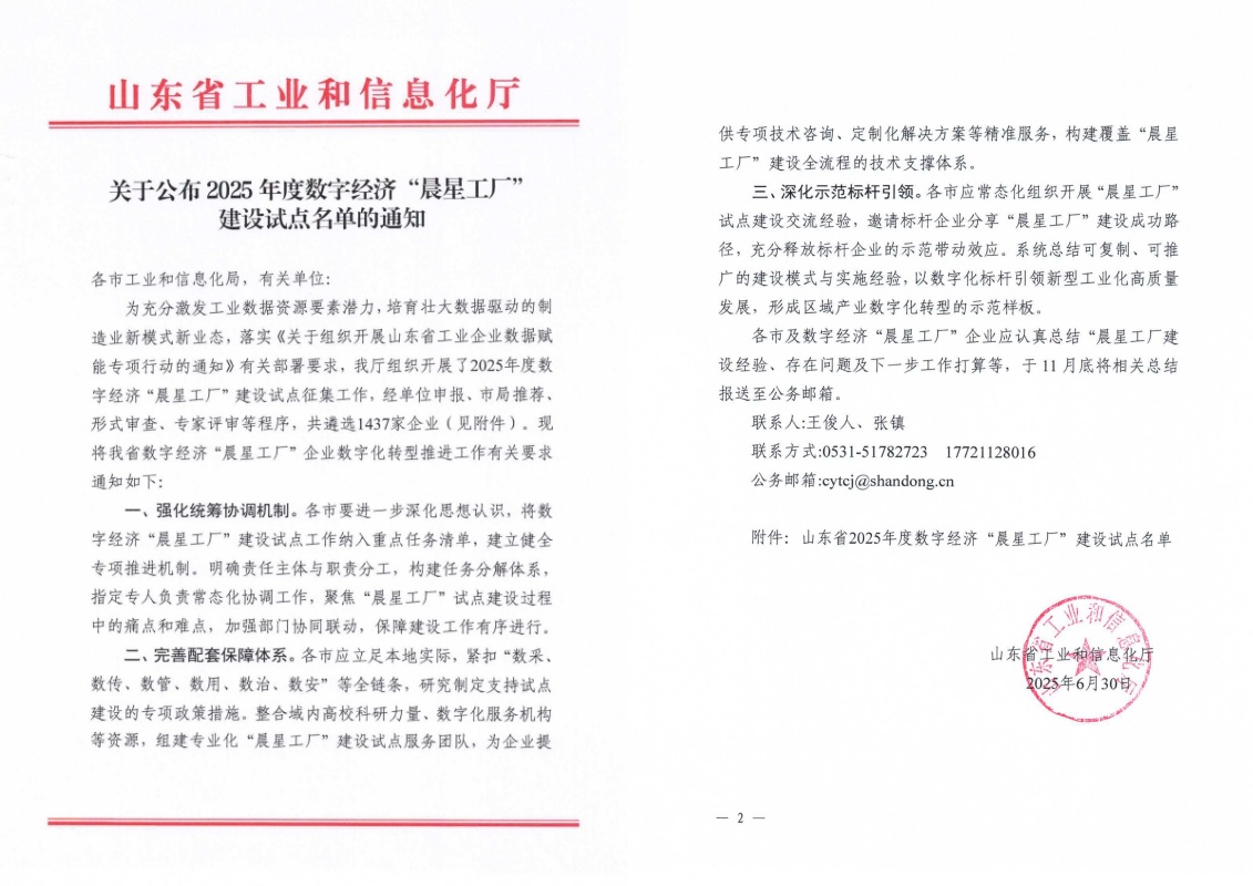 近日,山東省工業和信息化廳正式公布2025年度數字經濟“晨星工廠”建設試點名單,創新華一憑借其在數字化轉型領域的突出表現成功入選。這是我省深入推進“產業大腦+晨星工廠”實數融合新模式的重要成果,標志著公司在智能制造領域邁入新階段!