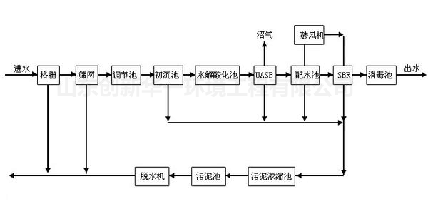 經過多年的實踐證明,對于易生物降解的有機廢水,生化處理是為有效和經濟的處理技術,包括厭氧、好氧技術和穩定塘等。對于濃度較高的有機廢水單獨的厭氧處理一般不能夠達到處理要求,單獨的好氧處理運行費用高,厭氧—好氧串聯工藝結合了厭氧 處理工藝和好氧處理工藝的優點而避免了各自的缺點,厭氧處理工藝能耗低、污泥產量低,負荷高,但出水不達標;好氧處理工藝出水水質好,運行穩定,但需能耗,污泥產量較高。因此厭氧—好氧串聯工藝在能耗、投資、處理成本和治理效果方面都具有較大的優越性。我們根據廢水的水質特點及種豬場具體條件,結合多項工程的成功經驗,本著投資省、運行費用低、操作管理方便的原則,確定了UASB厭氧—改良SBR—消毒—兼性塘處理工藝。