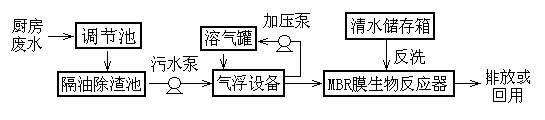 餐飲污水管網收集后進入污水處理系統,首先經格柵除去粗大的懸浮物,自流進入隔油池,除去餐飲污水中的動植物油脂,出水自流進入調節池調節水質水量,經污水泵提升進入一體化污水處理設備。餐飲污水首先經過水解酸化池,在厭氧菌的作用下,把大分子有機物轉化為小分子有機物,降低后續處理的負荷,提高處理效率;出水自流進入接觸氧化池,在好氧菌的作用下,把有機污染物轉化為低能位的無機物穩定下來,出水自流進入沉淀池,在沉淀池中進行泥水分離,使其達標排放。污泥沉淀后部分污泥回流至一體化設備內,剩余污泥由污泥泵打入污泥池,脫水干化后形成泥餅外運。