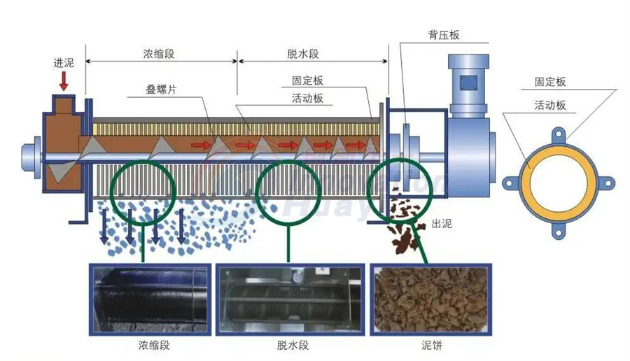(1)濃縮:當螺旋推動軸轉動時,設在推動軸外圍的多重固活疊片相對移動,在重力作用下,水從相對移動的疊片間隙中濾出,實現快速濃縮。