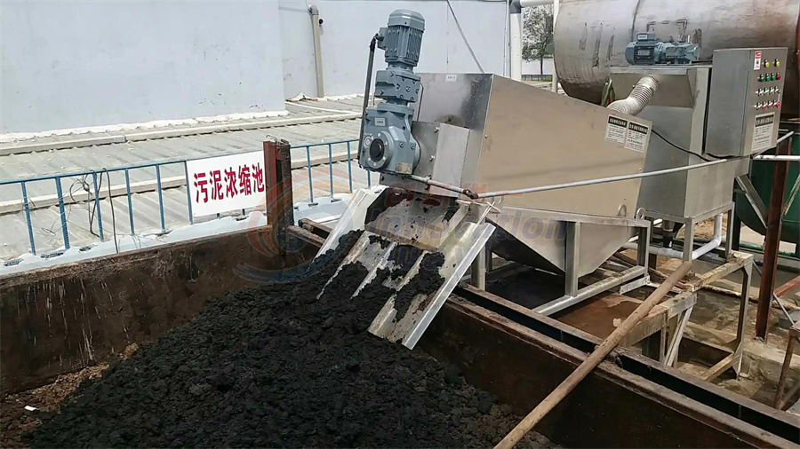(2)脫水:經過濃縮的污泥隨著螺旋軸的轉動不斷往前移動;沿泥餅出口方向,螺旋軸的螺距逐漸變小,環與環之間的間隙也逐漸變小,螺旋腔的體積不斷收縮;在出口處背壓板的作用下,內壓逐漸增強,在螺旋推動軸依次連續運轉推動下,污泥中的水分受擠壓排出,濾餅含固量不斷升高,實現污泥的連續脫水。