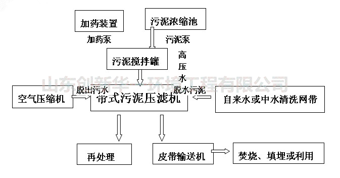 3、 污泥經(jīng)加藥處理后先送至濃縮段,經(jīng)過幾十秒種濃縮處理后污泥濃度達(dá)到2%-10%以上(視操作要求而定),然后經(jīng)過污泥配料裝置送到壓濾脫水段,然后形成具有一定含固率的泥兒餅。