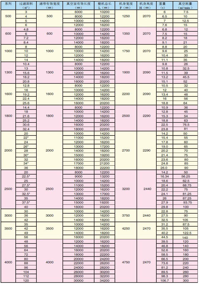 目前定型的有效過濾寬度:400mm,6300mm,1300mm,1800mm,2000mm,2500mm,2800mm,等系列.其中每個系列有不同面積,若干種規格(以兩米過濾長度增減)同一系列機身的寬度是一樣的,同一系列的不同規格其長度是不同的,同一系列面積越大過濾能力愈強,同一系列不同面積的濾機主要是為了滿足以下幾方面要求: