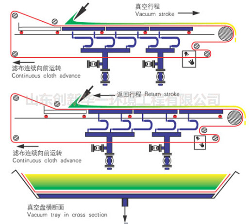 以濾布為過濾介質,采用整體的環形橡膠帶作為真空室。環形橡膠帶由傳動裝置傳動做直線運行,通過密封系統實現料漿的固液分離。當真空系統介入時,固體被載流在濾帶上通過刮刀卸除,液體被自動排液罐接收并通過水封裝置或切換裝置排出,濾布經過高壓沖洗液在線連續清洗獲得再生。實現物料從進料、脫水、順逆流洗滌、卸渣、濾液排放、濾布清洗和糾偏不間斷的連續進行。