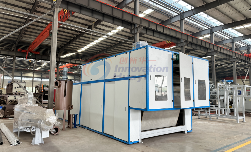 該設備是我公司在傳統帶式壓濾機基礎上,研發生產的全新一代污泥深度脫水機。設備增加了液壓裝置、污泥布料裝置,優化了調偏裝置、沖洗裝置和軸承座。新型超高壓帶式污泥脫水機脫水能力更強,可以在不添加或者少添加輔料的情況下,將污泥含水率降至60%以下。